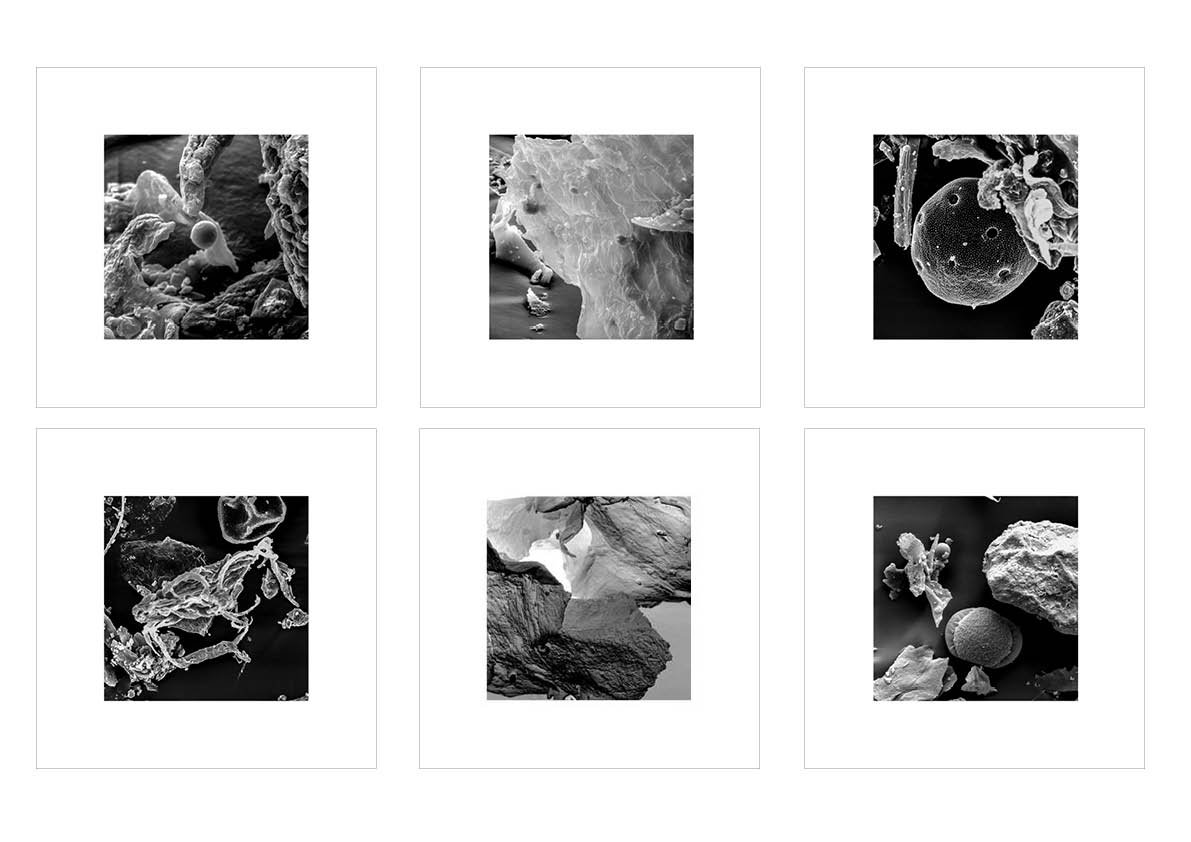 Ex nihilo (lat.: from nothing) is a series consisting of twelve photographs. It shows house dust, which were collected in different households. The photographs are an investigation into the aesthetics of the dust that surrounds us every day. In the microscopically small structures we seem to find macroscopic phenomena again. The work was taken with the help of a scanning electron microscope.